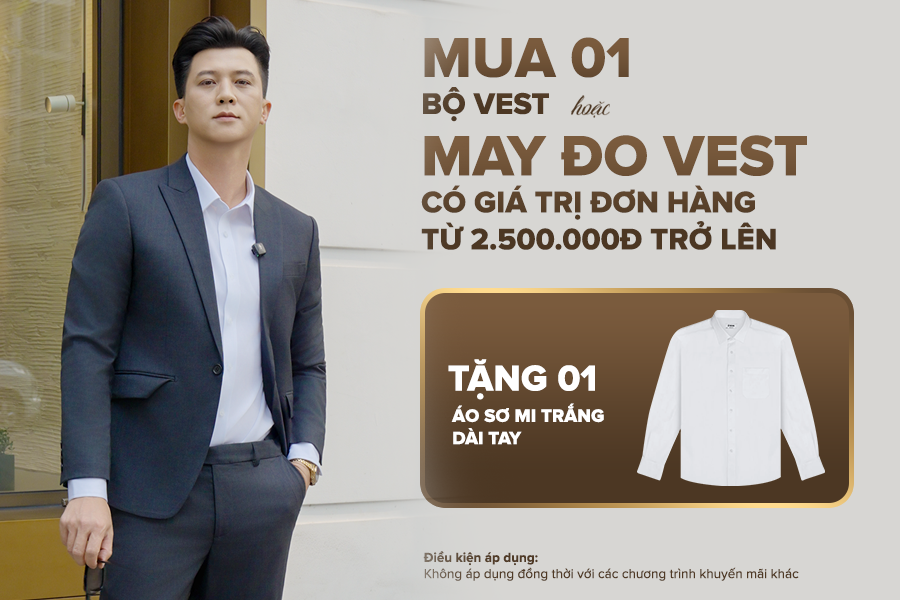 Mua 01 bộ vest hoặc may đo vest có giá trị đơn hàng từ 2.500.000đ trở lên → Tặng 01 sơ mi trắng dài tay